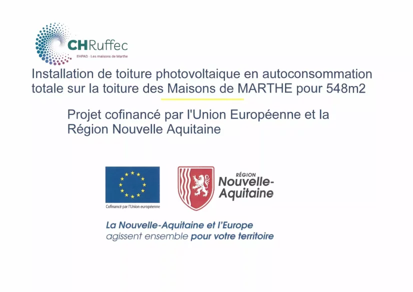 Ainsi, des panneaux photovoltaïques ont été installés et sont en fonctionnement depuis juin 2023 sur la toiture de l’EHPAD Les Maisons de Marthe sur une surface d’environ 550 m² avec une orientation au sud. Cette installation doit avoir une production estimée a 118300 kWh/an, soit l’équivalent de 34 foyers. L’électricité produite est destinée dans un premier temps à une autoconsommation par l’établissement, et permettra ainsi de réduire la facture d’électricité et l’empreinte carbone du Centre Hospitalier de Ruffec.